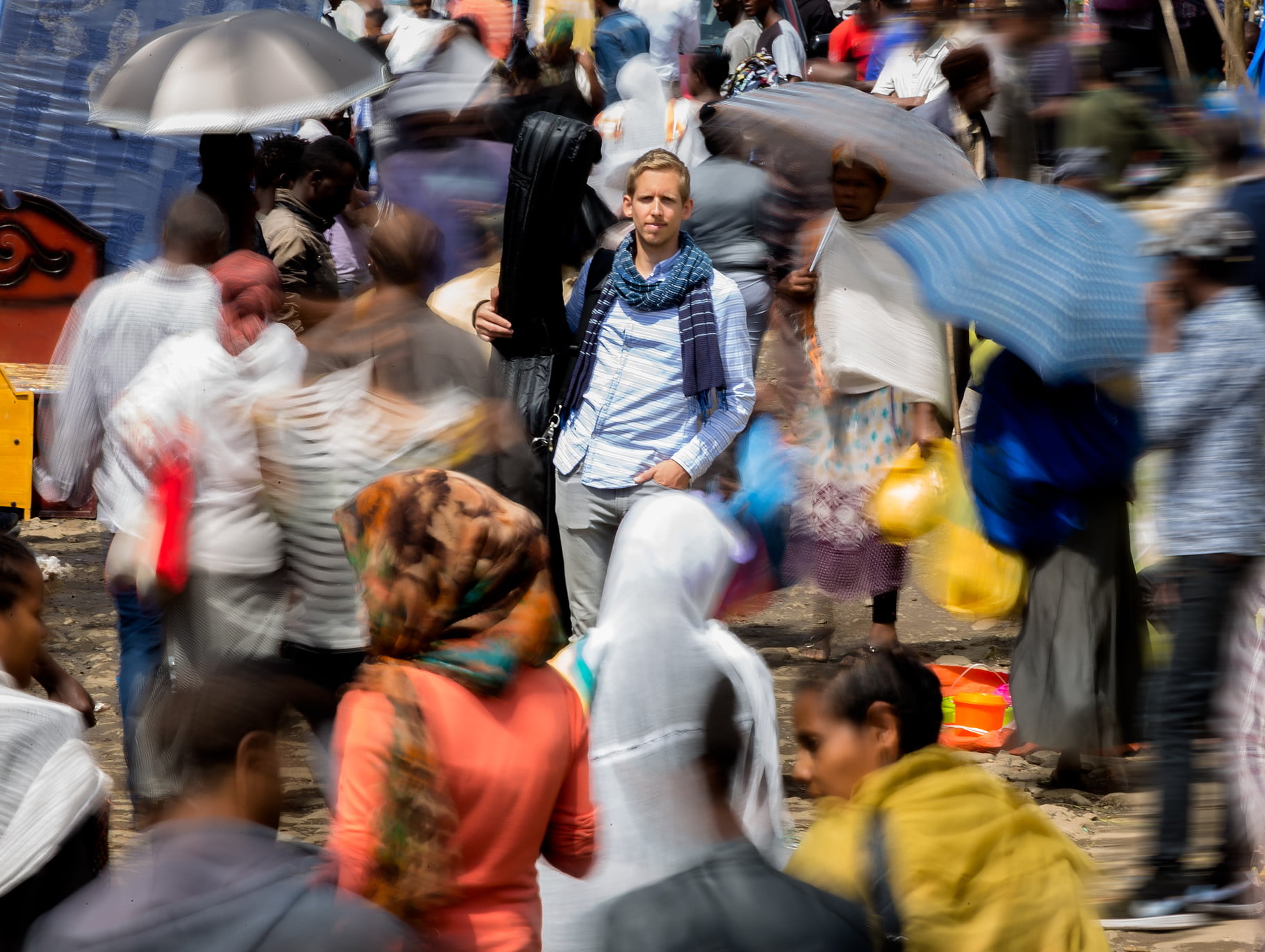 From the title of this new release—In Transit—as well as the cover, which shows a murmuration of swallows against an orange desert sky, we gather we are headed somewhere exotic. It is only after opening the sleeve that we discover this place is Ethiopia. In the photo, it is easy to spot the gringo walking through a busy African suk, carrying his bass. We don’t learn what prompted his Abyssinian sojourn, only that some of the pieces are “influenced directly from the rich sounds and musical traditions of Ethiopia, while others are more abstract interpretations of scenes of the country.”